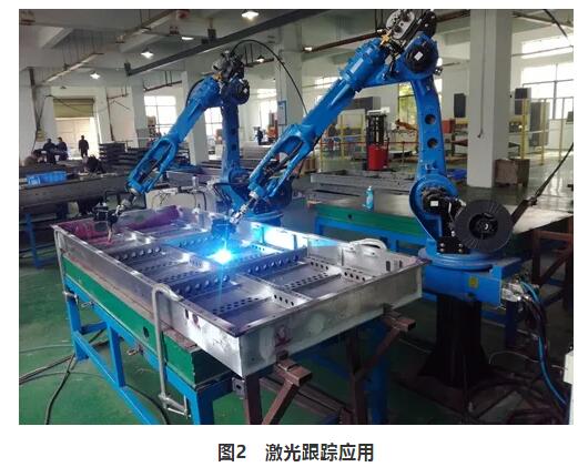 在實(shí)際自動(dòng)焊接過程中,激光焊縫跟蹤器的作用是對(duì)焊縫做精確的定位。一個(gè)完整的焊縫檢測(cè)跟蹤系統(tǒng)通常由激光結(jié)構(gòu)光傳感器、控制器及執(zhí)行機(jī)構(gòu)組成,它們構(gòu)成了一個(gè)完整的閉環(huán)控制系統(tǒng),實(shí)現(xiàn)了檢測(cè)、計(jì)算和執(zhí)行的功能。在實(shí)際使用中執(zhí)行機(jī)構(gòu)有可能是由伺服電動(dòng)機(jī)、直線導(dǎo)軌滑臺(tái)組成的焊接專機(jī),也可能是焊接機(jī)器人??刂破饕话銥楣た貦C(jī)或FPGA、DSP等嵌入式處理器。除此以外,一般還包括焊接電源、工裝夾具及上下料機(jī)構(gòu)等。機(jī)器人自動(dòng)焊接工作站就是一種典型的應(yīng)用,首先通過視覺傳感器尋位確定工件及焊縫的位置,修正真實(shí)焊縫的焊接起始位置,在焊接過程中啟動(dòng)實(shí)時(shí)跟蹤,通過實(shí)時(shí)的控制機(jī)器人不斷修正機(jī)器人的焊接軌跡,達(dá)到準(zhǔn)確的自動(dòng)焊接(見圖2)。目前常用的跟蹤控制方式有無標(biāo)定的模糊跟蹤、標(biāo)定實(shí)時(shí)跟蹤、尋位及跟蹤+尋位方式。無標(biāo)定的模糊跟蹤不需要精確標(biāo)定實(shí)時(shí)檢測(cè)焊槍與焊縫的偏差,并實(shí)時(shí)地做趨勢(shì)微調(diào)控制。標(biāo)定實(shí)時(shí)跟蹤檢測(cè)的是焊縫的實(shí)際絕對(duì)位置,同時(shí)控制焊槍運(yùn)動(dòng)到焊縫的實(shí)際絕對(duì)位置。尋位方式指焊接時(shí)不實(shí)時(shí)跟蹤,在焊接前通過兩點(diǎn)或多點(diǎn)尋位確定當(dāng)前焊縫或工件的位置,提前修改執(zhí)行機(jī)構(gòu)的運(yùn)動(dòng)軌跡,從而實(shí)現(xiàn)精確的焊接。跟蹤+尋位方式則是標(biāo)定實(shí)時(shí)跟蹤與尋位方式的結(jié)合。
