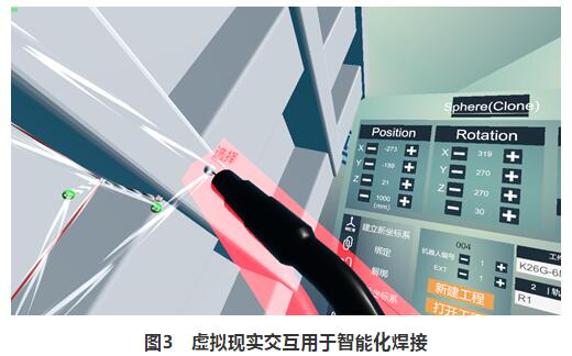 (3)虛擬現(xiàn)實(shí)仿真與人機(jī)交互技術(shù)。在目前的智能化焊接中,技術(shù)人員通過Unity3D在虛擬仿真與人機(jī)交互技術(shù)實(shí)現(xiàn)了虛擬現(xiàn)實(shí)交互的焊接(見圖3)。人機(jī)交互界面負(fù)責(zé)機(jī)器人運(yùn)動(dòng)信息反饋和機(jī)器人的控制,人再通過人機(jī)交互界面對(duì)焊接機(jī)器人實(shí)施遠(yuǎn)端操作,從而達(dá)到人機(jī)交互,在一定程度上可以替代示教編程及離線編程。在復(fù)雜、惡劣的環(huán)境中將遠(yuǎn)端焊接機(jī)器人與虛擬現(xiàn)實(shí)結(jié)合起來并實(shí)施人機(jī)交互,既能保證焊接工人的安全又能高效地完成焊接作業(yè)。