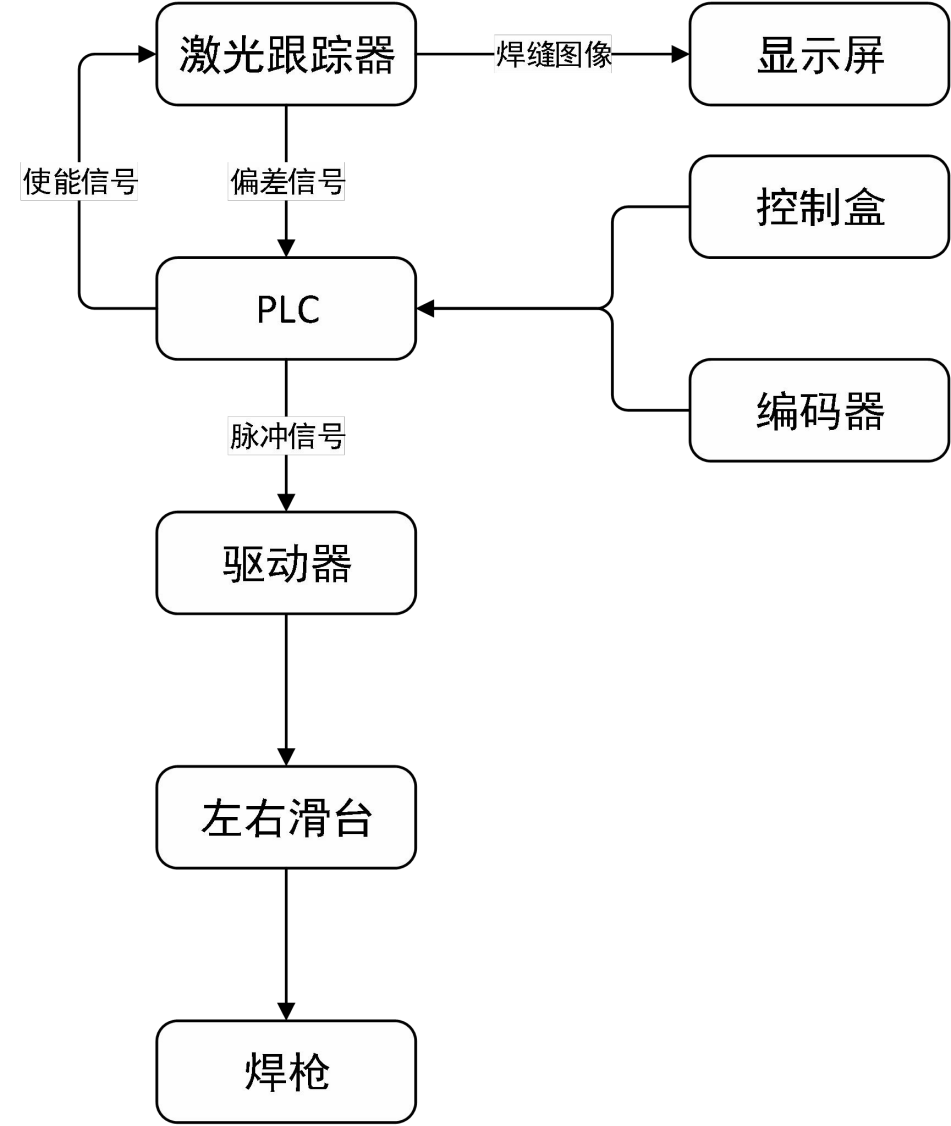 如圖 下圖所示,設(shè)備包含激光跟蹤器,人機(jī)界面,微嵌屏,PLC 控制柜,驅(qū)動(dòng)器, 跟蹤滑臺(tái),擺動(dòng)滑臺(tái),控制盒。激光焊縫跟蹤器通過激光發(fā)射與接收,經(jīng)過內(nèi)部算法處理得到焊縫圖像與偏差信號(hào)。焊縫圖像通過網(wǎng)口傳送給顯示屏,顯示屏顯示圖像。伺服編碼器計(jì)算旋轉(zhuǎn)電機(jī)的旋轉(zhuǎn)脈沖數(shù),轉(zhuǎn)換成行走距離,發(fā)給 PLC 用于實(shí)現(xiàn)多層多道。跟蹤器檢測(cè)出的正確焊縫位置數(shù)據(jù),通過以太網(wǎng)通訊發(fā)給 PLC,經(jīng)過 PLC 運(yùn)算處理轉(zhuǎn)化成脈沖信號(hào)發(fā)送給驅(qū)動(dòng)器,從而調(diào)正焊槍位置、擺幅寬度,與焊接速度。