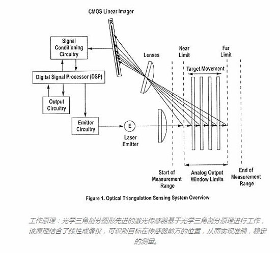 目標(biāo)與傳感器的距離決定了光線穿過(guò)接收器透鏡的角度;然后,該角度確定接收到的光將照射到線性成像器的位置。如果目標(biāo)距離較遠(yuǎn)(在最大指定范圍內(nèi)),則光將朝成像器最靠近激光發(fā)射器的一端落下?;蛘撸绻繕?biāo)位于其最接近的位置(在最小指定范圍內(nèi)),則光將降落在成像儀的相對(duì)端,距激光發(fā)射器最遠(yuǎn)。線性成像儀上的光線位置在出廠時(shí)已針對(duì)所有有效目標(biāo)距離進(jìn)行了校準(zhǔn)。接收到的光通過(guò)模擬和數(shù)字電子設(shè)備進(jìn)行處理,并由數(shù)字信號(hào)處理器(DSP)進(jìn)行分析。