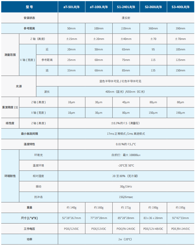 品牌名為小不點(diǎn)aTINY,全系列產(chǎn)品可支持30-400mm的檢測(cè)距離(Z軸范圍),紅激光系列可支持0.01mm的檢測(cè)精度,藍(lán)紫激光系列可支持0.005mm的檢測(cè)精度。
